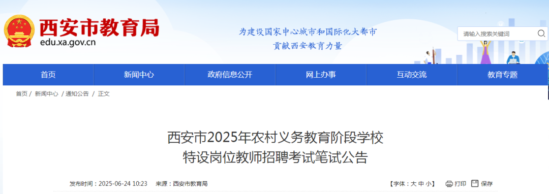6月24日 西安市教育局网站发布 西安市2025年农村义务教育阶段学校 特设岗位教师招聘考试笔试公告 内容如下 ↓↓↓ ▲点击上图可查看详情 根据省教育厅、省委编办、省财政厅、省人社厅和省医保局《关于做好2025年农村义务教育阶段学校教师特设岗位计划实施工作的通知》(陕教〔2025〕17号)、《陕西省教育厅办公室关于做好2025年特岗教师招聘考试工作有关事项的通知》(陕教师办〔2025〕16号)和《西安市2025年农村义务教育阶段学校特设岗位教师招聘公告》,现就西安市2025年特岗教师招聘笔试工作有关事项公告如下: 一、考试科目 2025年陕西特岗教师招聘考试笔试科目包括教育理论知识和学科专业知识两科,单科成绩满分为100分。 二、考试时间 2025年7月5日(星期六) 三、考试地点 考点:西安职业技术学院 地址: 西安市雁塔区鱼斗路251号 乘车路线:乘坐公交711路、高新5号线、830路至西安职业技术学院站下车即到,或乘坐地铁3号线在鱼化寨站下换乘公交711路、高新5号线至西安职业技术学院站下车即到。 四、考生须知 1.及时打印准考证。参加2025年陕西特岗教师招聘考试资格审核合格的考生,应于6月30日(星期一)上午9:00起,登录“陕西省特岗教师管理信息系统(网址:http:// tgjs.sneducloud.com),自行下载并打印准考证,作为参加本次特岗教师招聘考试的主要依据。考生应对准考证信息的真实性、准确性和有效性负责,准考证不得涂改、转借。 2.考试当天,在考试前60分钟到达考点,间隔1米以上有序排队接受安检。符合参加考试条件的考生,应在考前30分钟进入考场,按指定座位号入座,并将《准考证》《身份证》放在课桌左(右)上角。禁止考生穿背心、拖鞋、响底鞋等进入考场。 3.考生应自带文具,其中蓝、黑色钢笔或签字笔、2B铅笔和橡皮为必带文具。进入考场,须将所带书籍资料、衣物、无线通信工具(手机)、电子记事本等与考试无关的物品按监考要求集中存放(其中电子通讯设备一律保持关闭状态且取消闹钟,禁止随身携带)。进入考场后须保持肃静,不准吸烟和谈笑。考试期间不得上厕所。凡离开考场,不准再次进入。 4.答卷前,考生须在试卷及答题纸规定的位置填写清楚考区(考点)、考场号、姓名、准考证号和座位号等。迟到15分钟不准进入考场;开考90分钟后方准交卷离开考试教室(因突发自然灾害或重大疾病等特殊情况除外),考生提前交卷后应退至警戒线以外等候,不得影响其他考生正常答卷。 5.答题须在统一印刷的试卷规定位置或专用答题纸上用蓝色或黑色钢笔、签字笔书写,字迹要工整、清晰。用铅笔、红色笔书写的答卷一律无效。需要在答题卡作答的一律使用2B铅笔,否则无效。答卷上禁止使用涂改液。 6.考生遇试卷分发错误及试题字迹不清等问题可举手询问,涉及试题内容的疑问,不得询问。考生在考场内必须严格遵守考场纪律,不准交头接耳、左顾右盼;考试期间不准借用文具,不准偷看、抄袭他人答卷,不准夹带、冒名替考或换卷。 7.考试期间,考生应模范遵守《2025年陕西特岗教师招聘考试考场规则》,自觉服从监考人员管理,认真参加考试。离开考场时必须交卷,不得携带试卷和答题纸(含答题卡)离开考场。按照《国家教育考试违规处理办法》有关规定,对有违纪行为的,取消该科目的考试成绩;对有作弊行为的,其当次报名参加考试的各科成绩无效,且3年内不得再次报名参加陕西特岗教师招聘考试。 五、咨询电话 西安市特岗办咨询电话:029-86787710 附件: 西安市特岗计划实施工作领导小组办公室 2025年6月24日